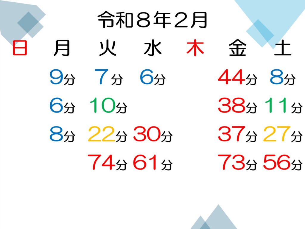 投稿日: 2026年3月3日2月の待ち時間状況 2月の受付から診察までの待ち時間の平均は以下のようでした。最終週は1診のみのため長時間の待ち時間となりました。待ち時間へのご理解、ご協力をありがとうございました。